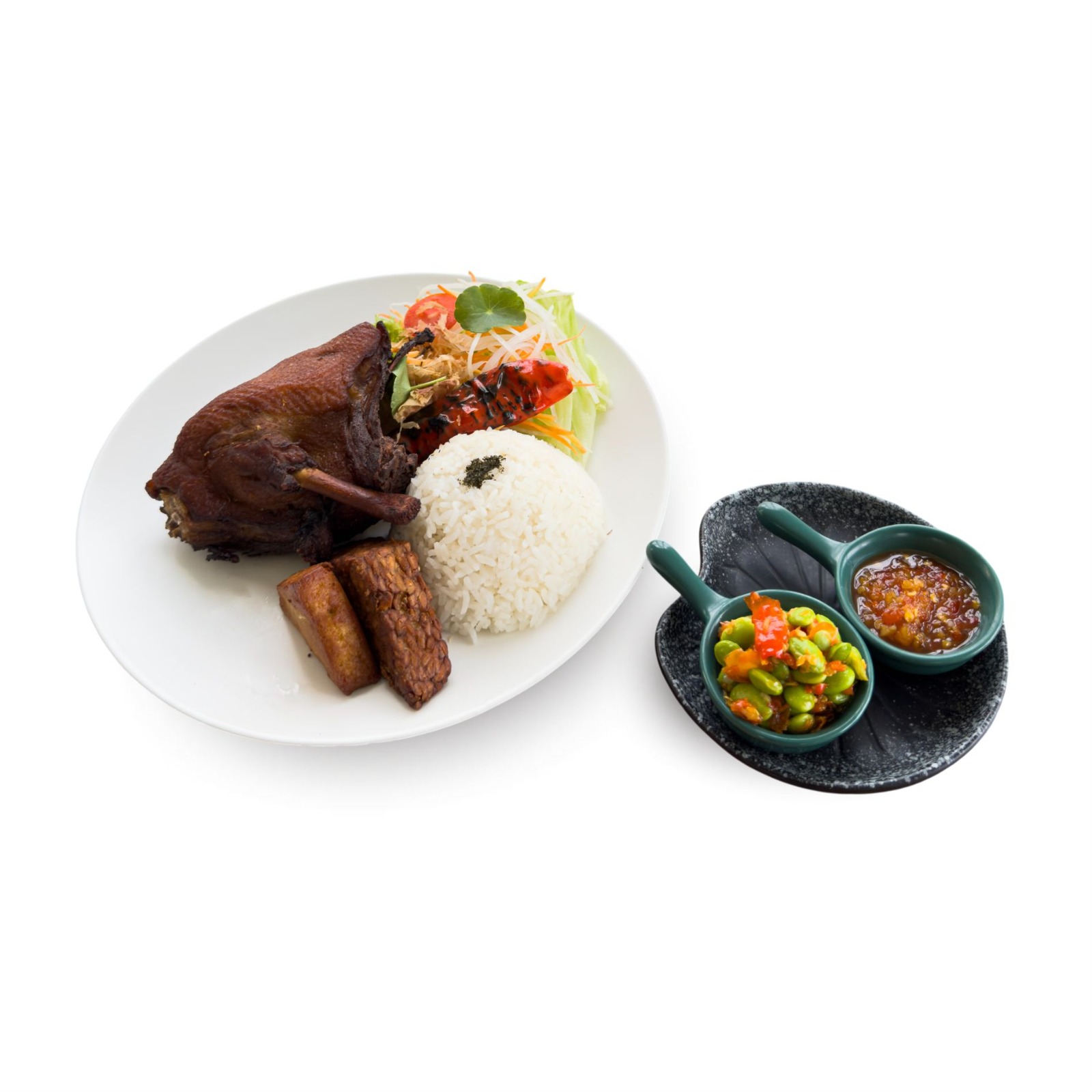 Baby green lettuce and pomelo served with caramelize duck sauce and topped with slice crispy pecking duck.